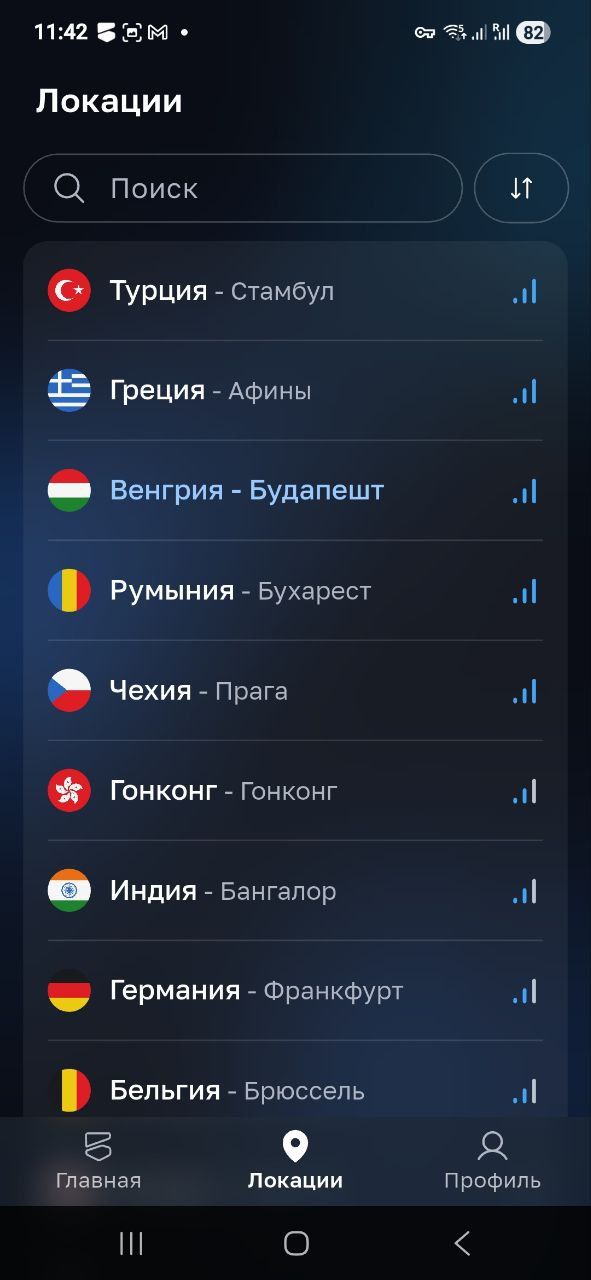 Приложение позволяет подключиться к любой из 37 локаций BlancVPN. По умолчанию они расположены в рекомендуемом порядке: по удаленности от вашего местоположения и загруженности серверов в данный момент. Доступна сортировка локаций и быстрый поиск с устойчивостью к опечаткам.