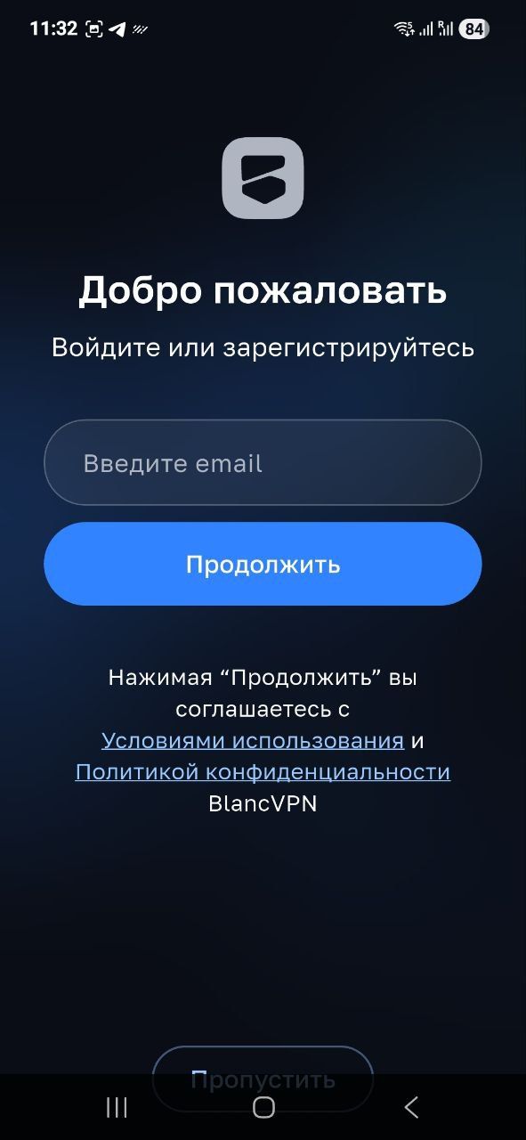 При первом запуске приложение предложит войти в аккаунт. Если у вас уже есть подписка BlancVPN, просто введите адрес электронной почты, на которую она оформлена.