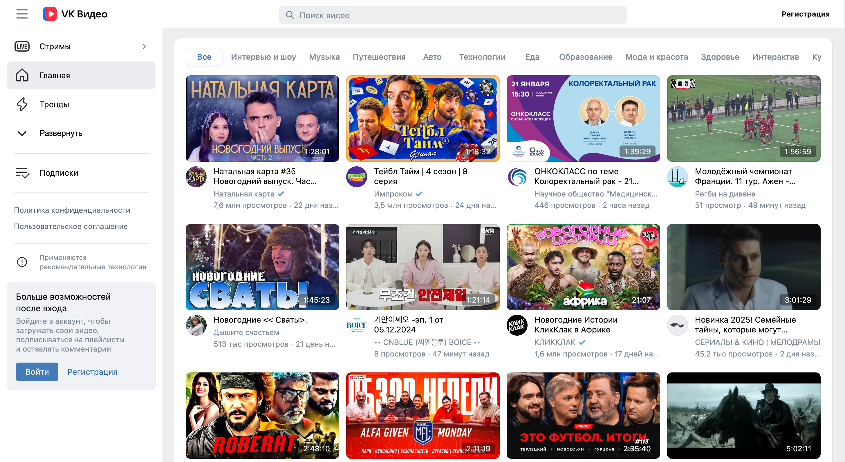 Видеоплатформа, на которой можно загружать, просматривать и делиться видео. Сервис поддерживает прямые трансляции и короткие вертикальные видео — Clips. В декабре 2024 года сервис переехал на отдельный сайт, теперь видео можно смотреть без входа в соцсеть ВКонтакте.