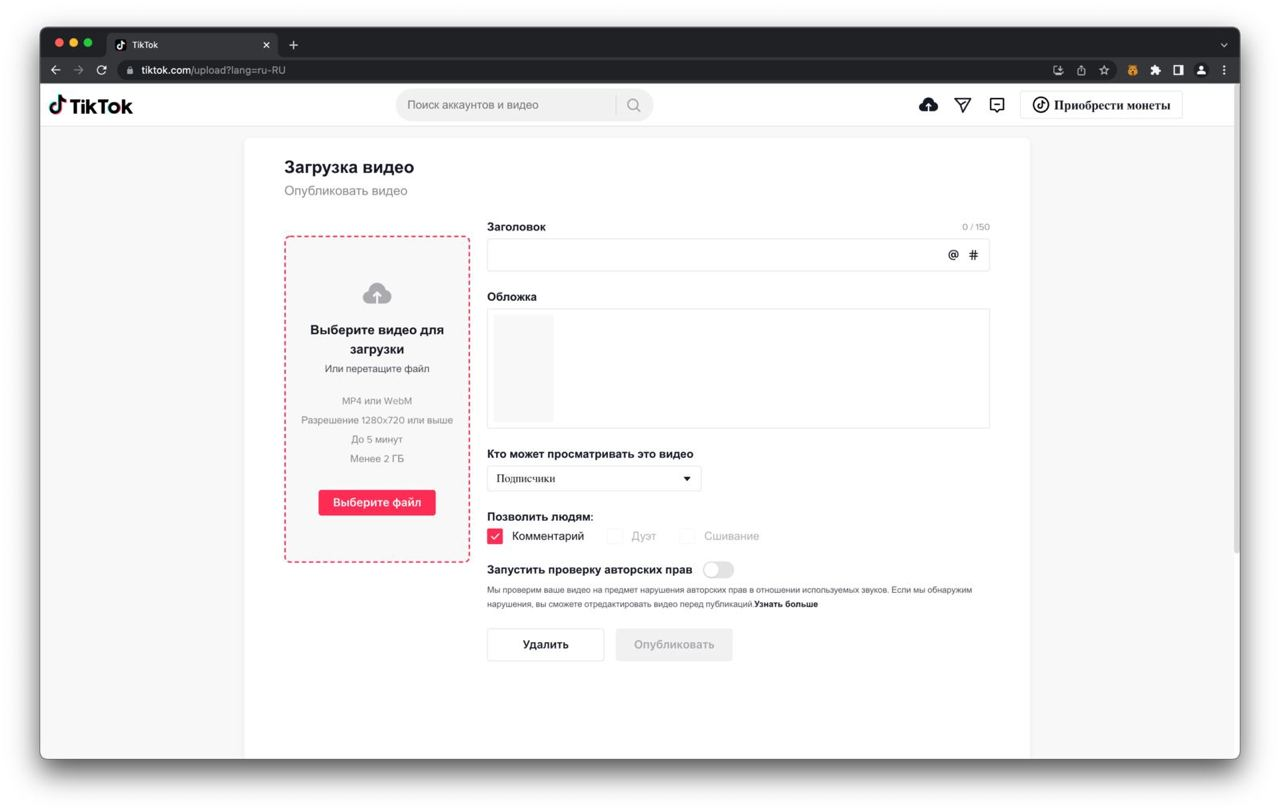 Публиковать видеоролики в веб-версии Тик-Ток удобнее с компьютера. Поэтому предварительно нужно будет его снять, смонтировать и перекинуть со смартфона на ПК. Последовательность действий следующая: