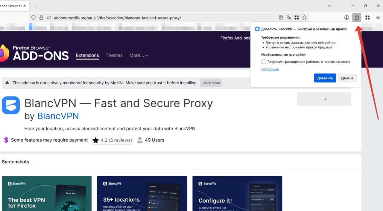 После того, как VPN для Firefox загрузится, нажмите на иконку в верхней панели и выберите “Добавить”.